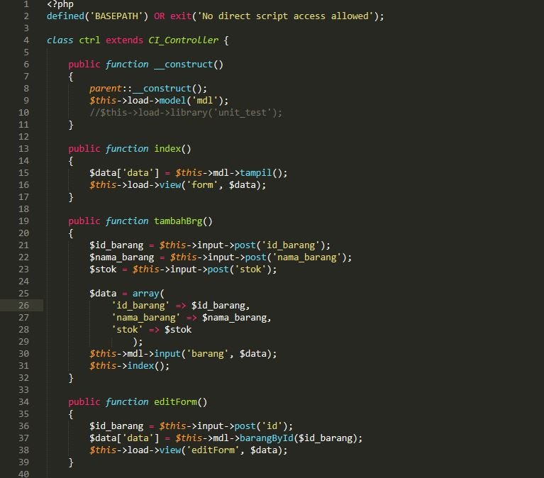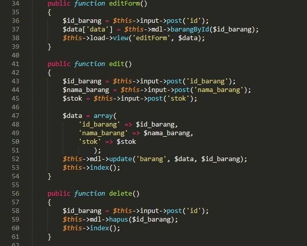 - Function edit() — Digunakan untuk memproses inputan dari FORM EDIT BARANG sesuai ID_BARANG nya dan setelah proses selesai dikembalikan ke Function INDEX()