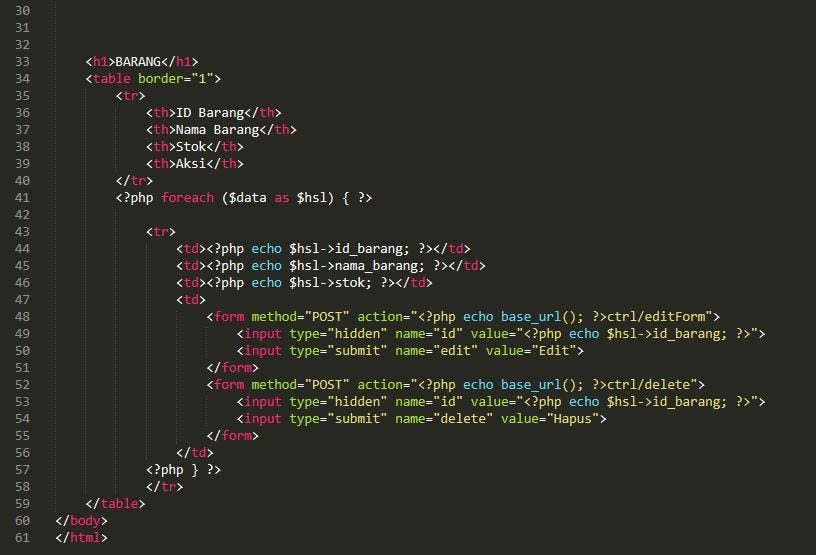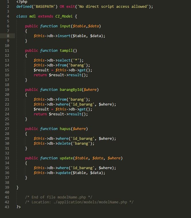 - Function tampil() — Digunakan untuk menampilkan data barang dengan query SELECT pada Mysql seperti SELECT * FROM barang, lalu hasil dari query tersebut di get() dan dikembalikan hasilnya menjadi return $result->result()
